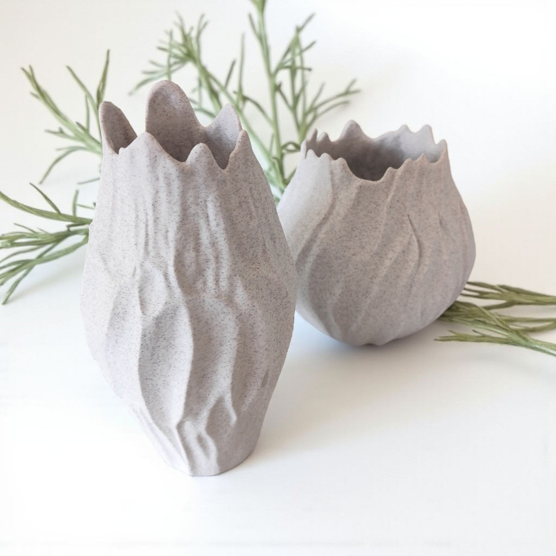 Apportez une touche naturelle et contemporaine à votre intérieur avec ce duo de vases au design sculptural, fabriqués en impression 3D. Leurs lignes inspirées de la nature et leur texture minérale s’intègrent parfaitement dans une décoration épurée et chaleureuse.