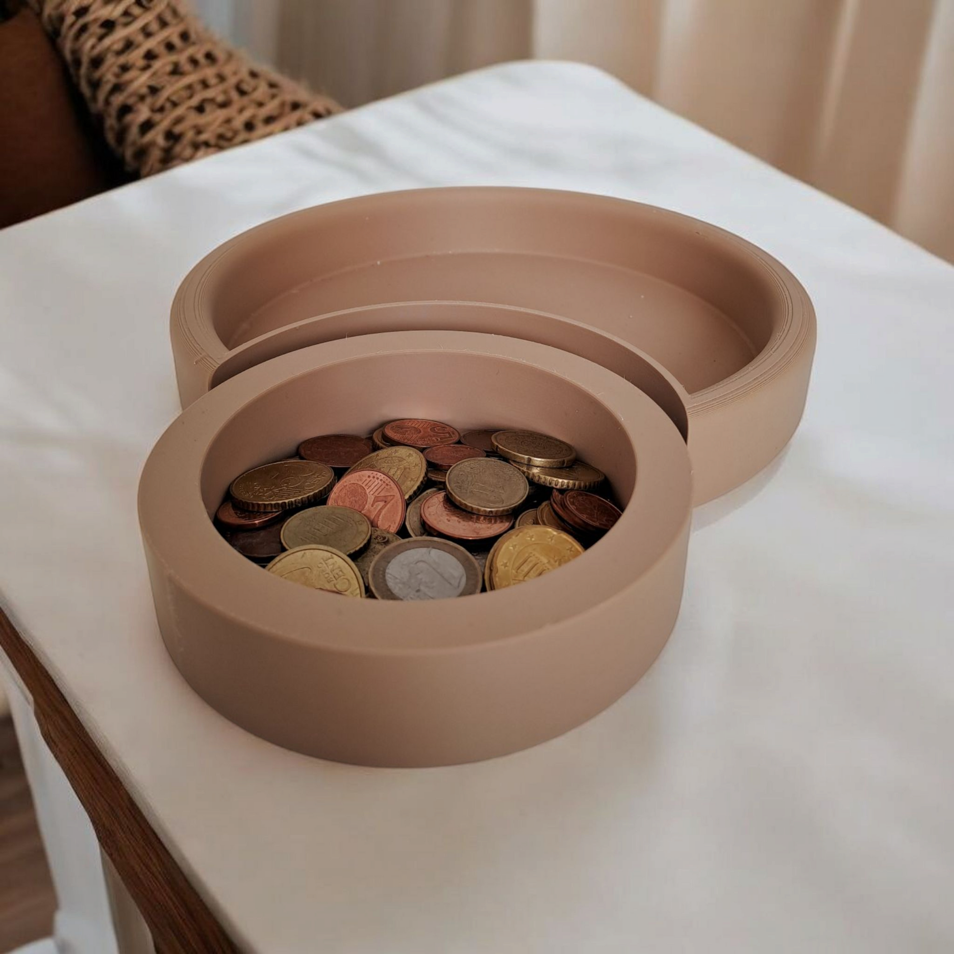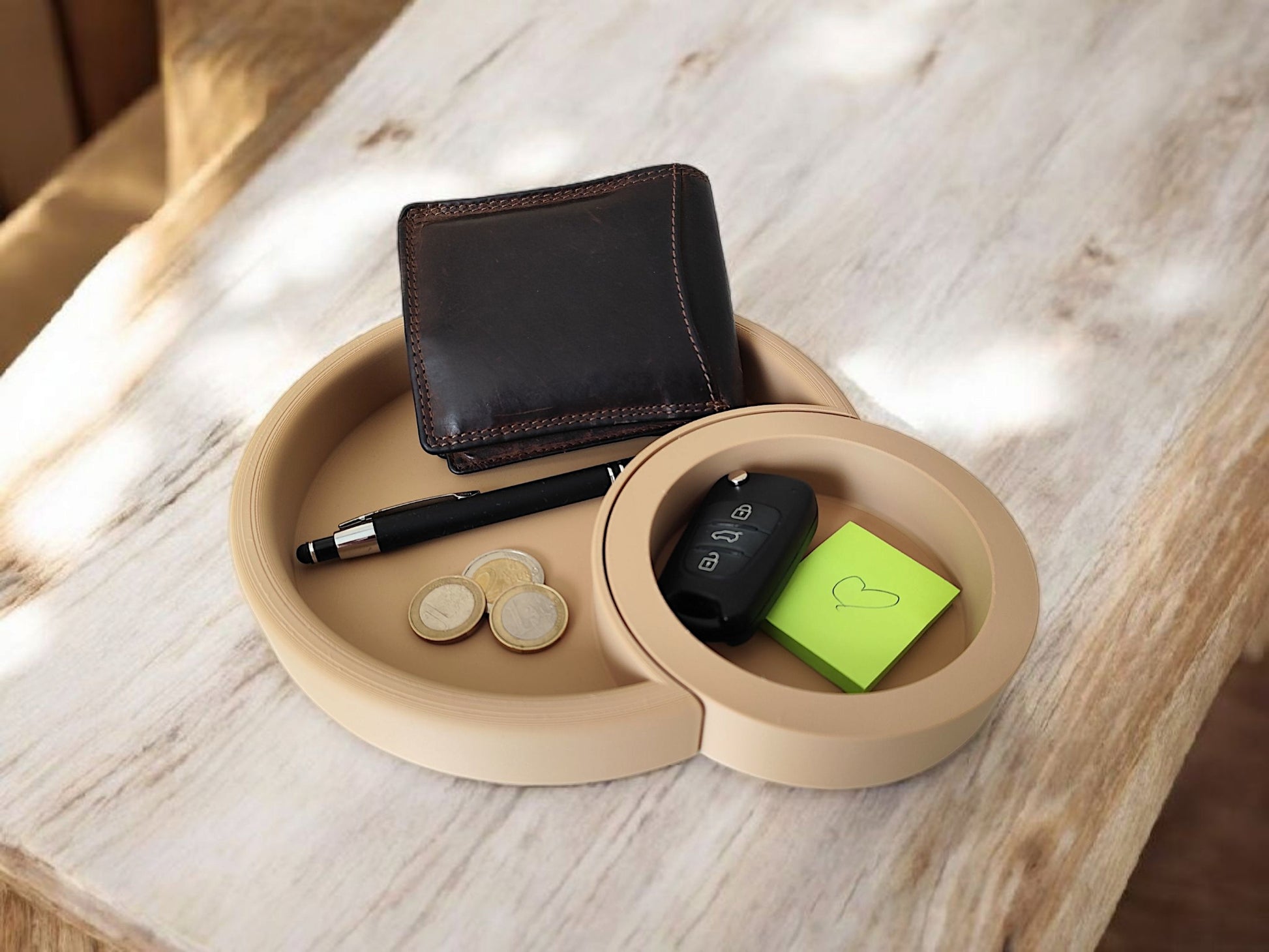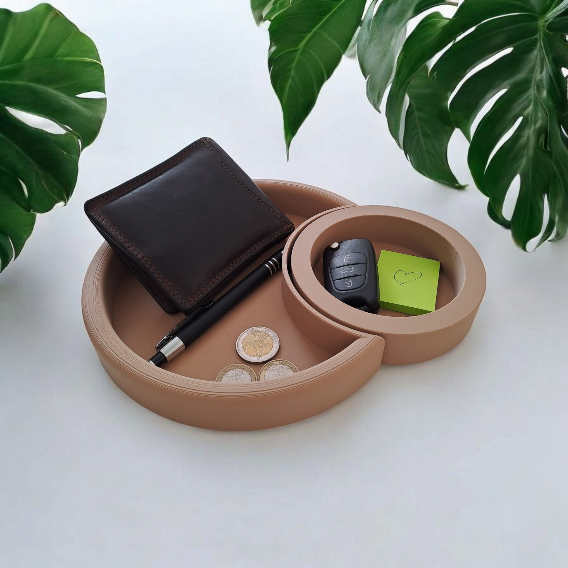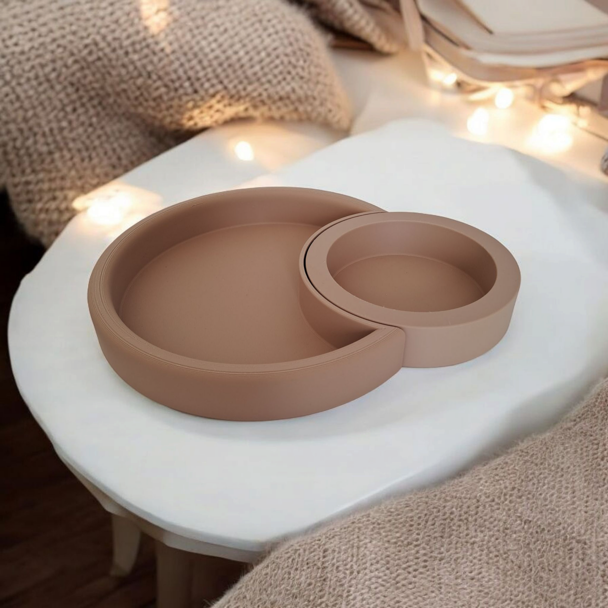 Plateau croissant de lune en impression 3D – un rangement design et pratique en deux parties. Idéal comme vide-poche ou organisateur de bureau. Disponible en plusieurs couleurs.