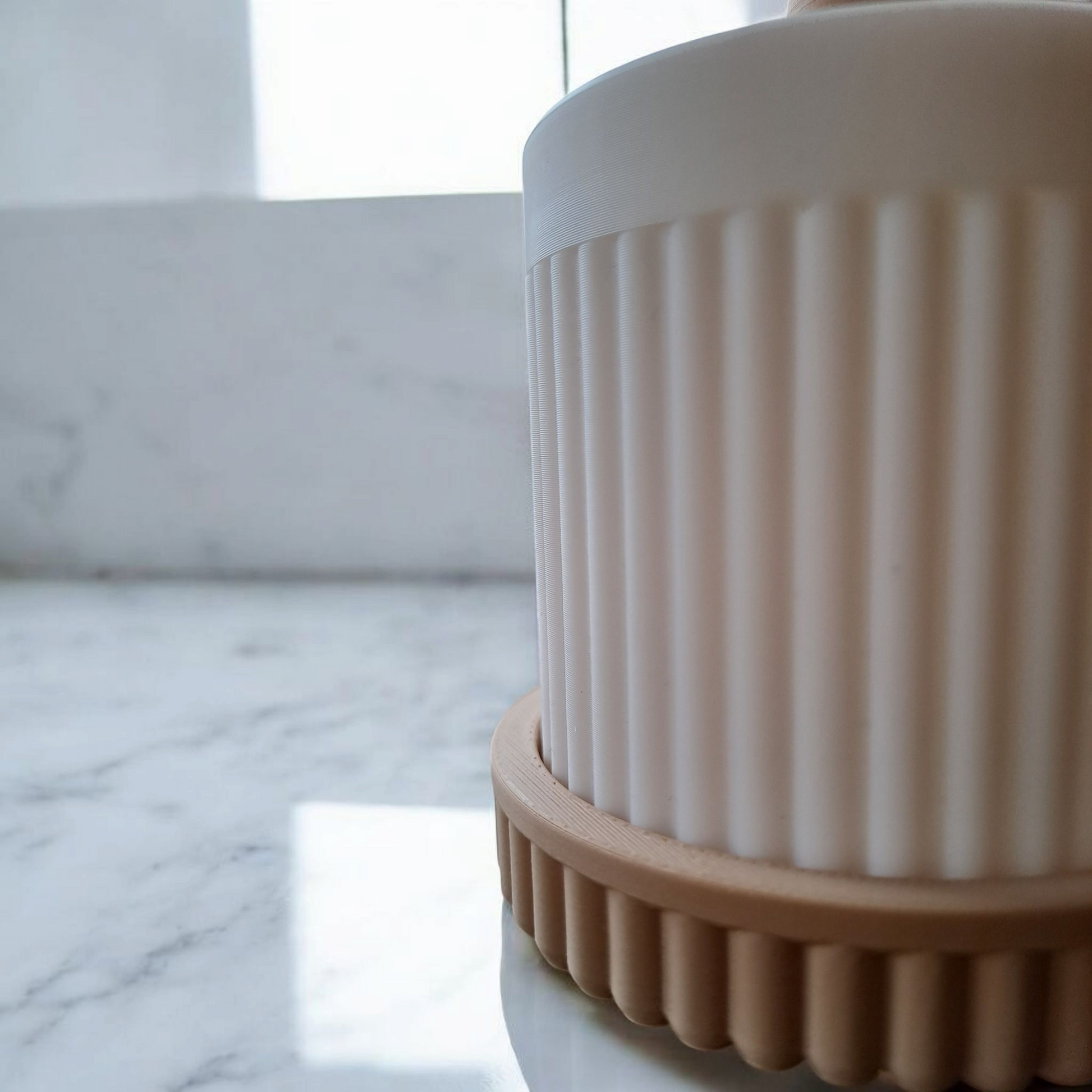 Apportez une touche de raffinement moderne à votre salle de bain ou votre coiffeuse avec ce set de rangement ovale avec pot rainuré, conçu en impression 3D.